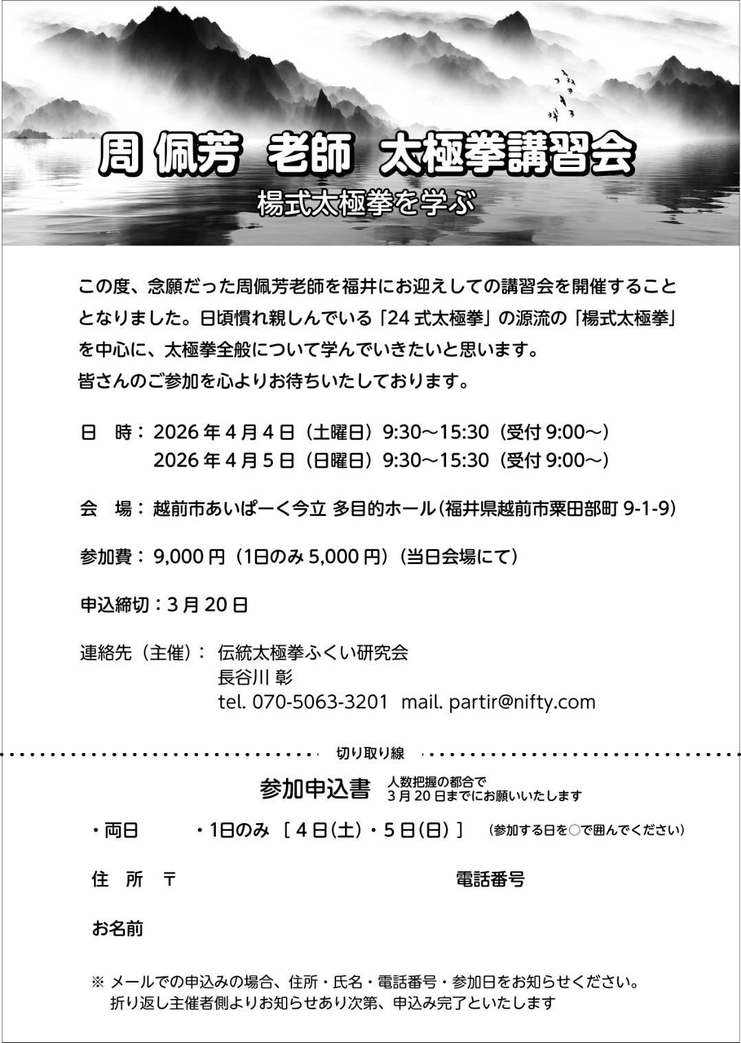 【祝】周佩芳老師の太極拳講習会が福井で開催されます。